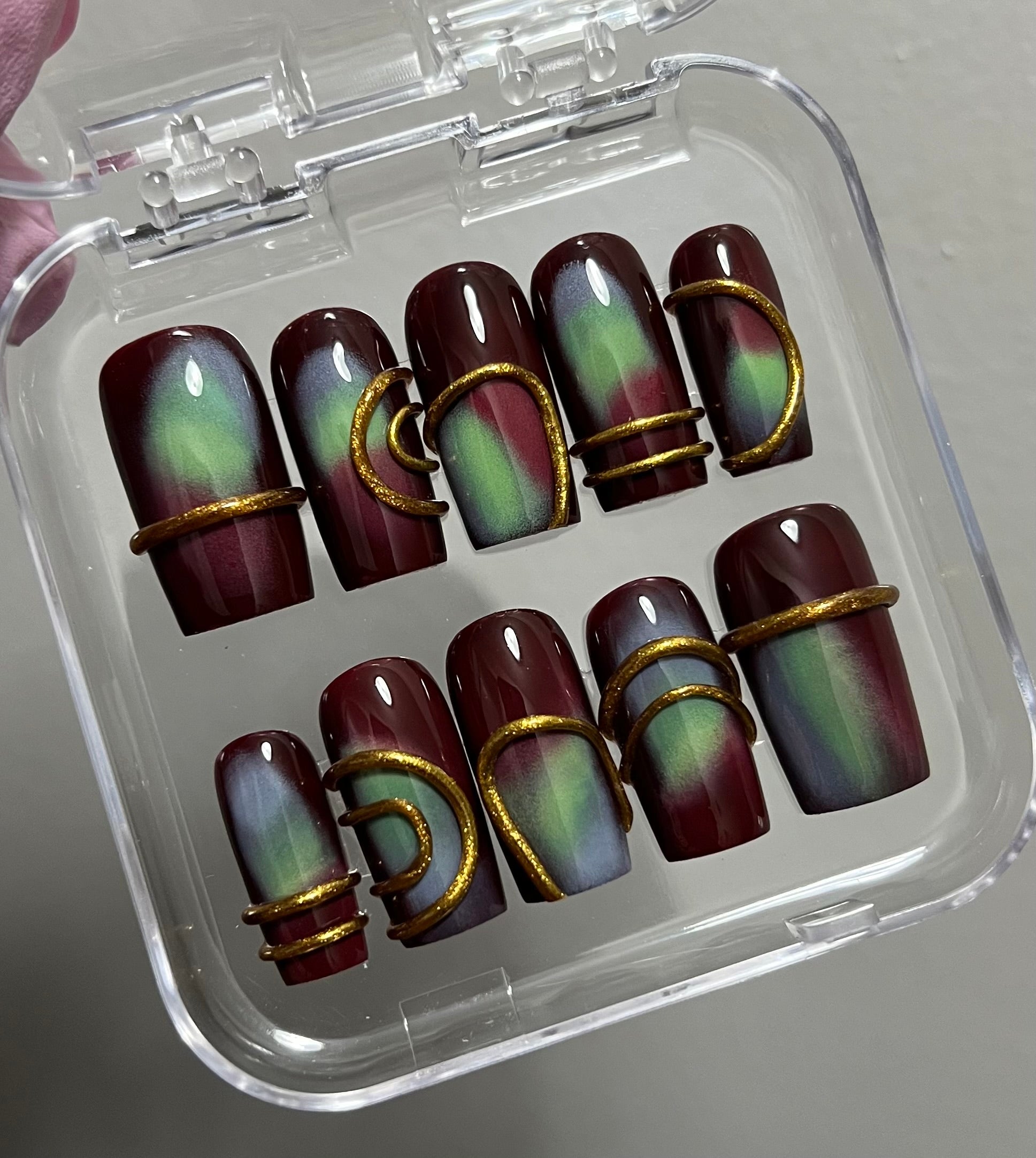 This set has a beautiful maroon base with a rainbow aura effect and gold 3D art.