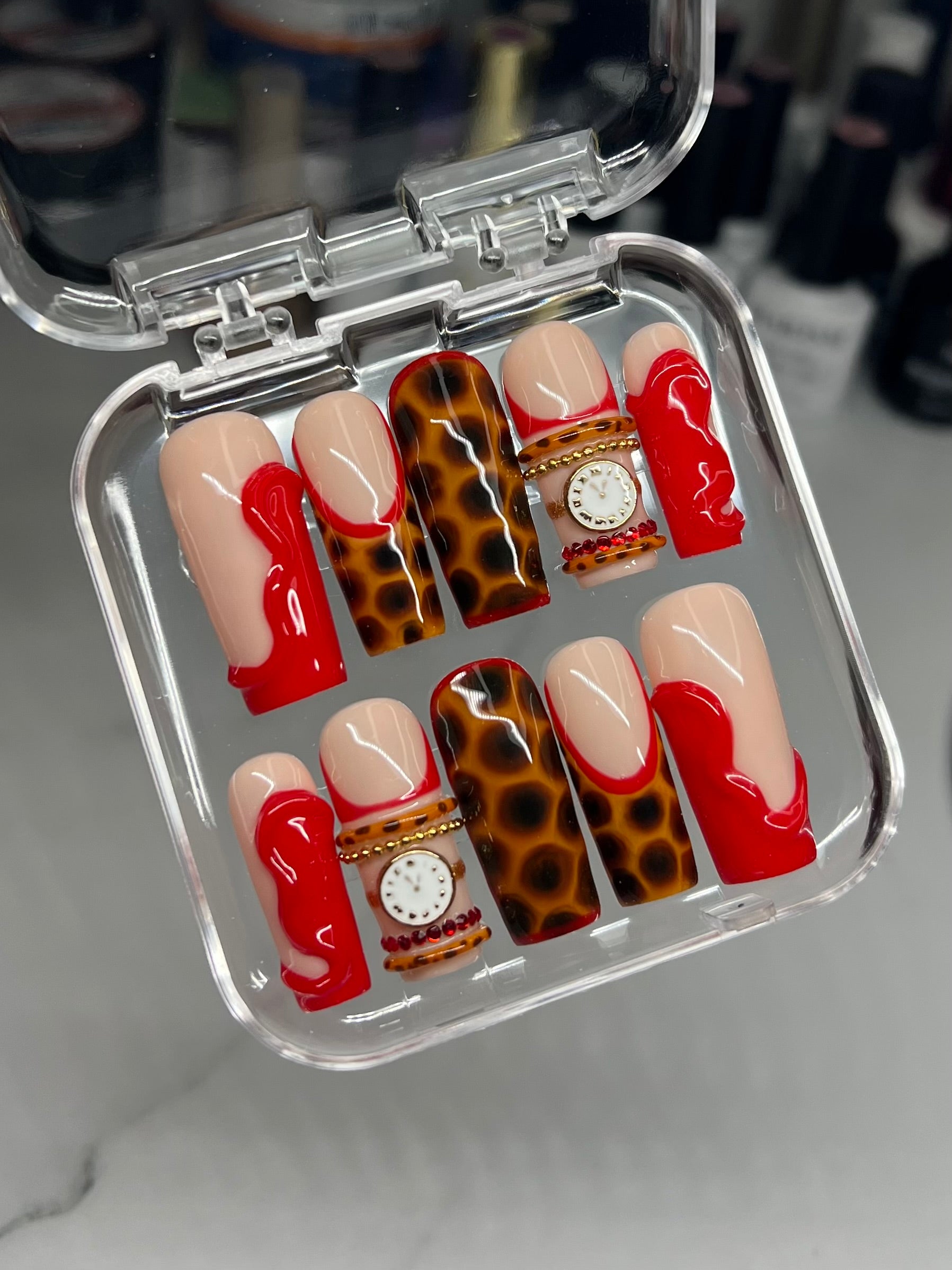 This set is accented with tortoise shell, bangle, and a red 3D outlined design.